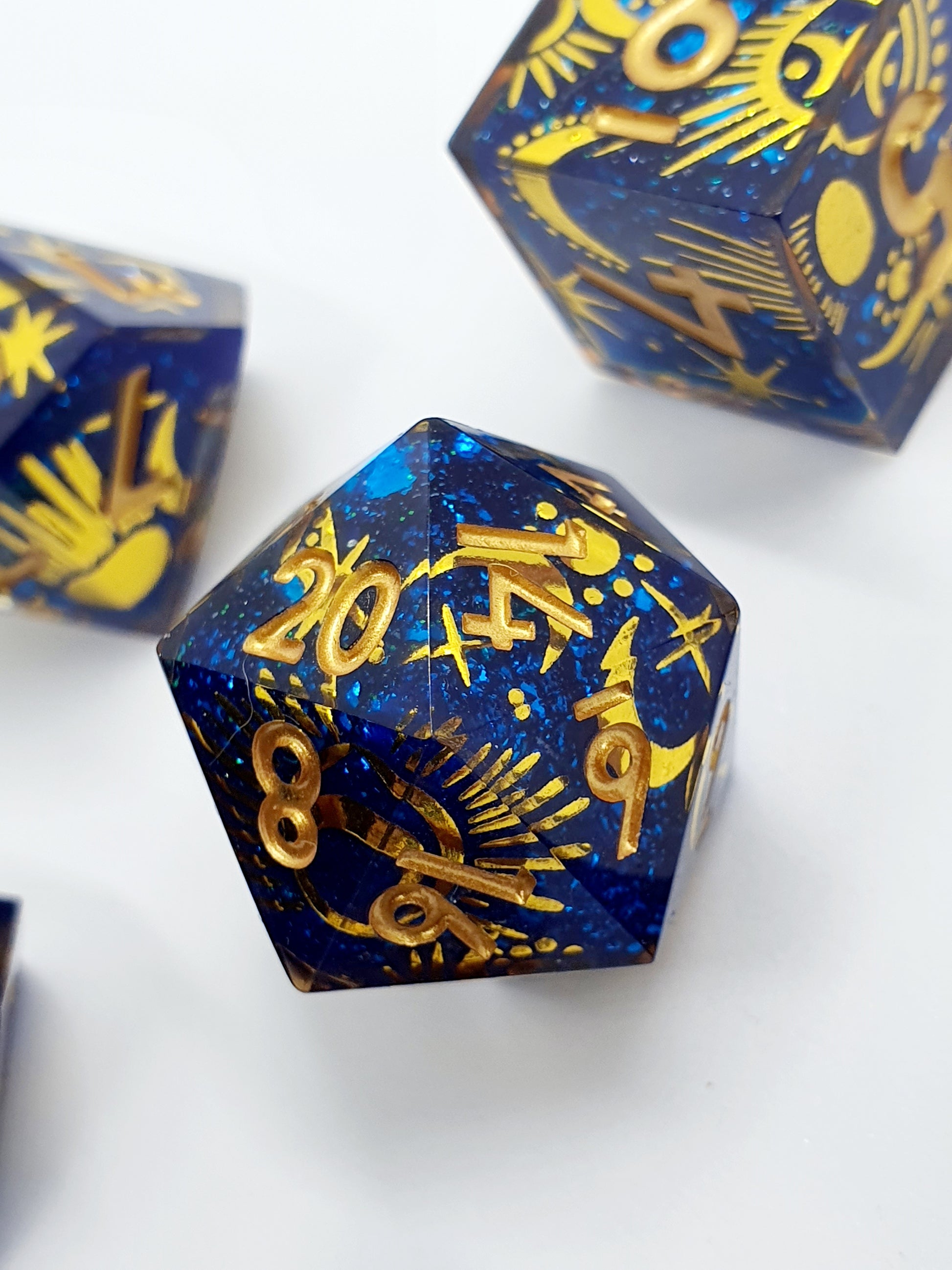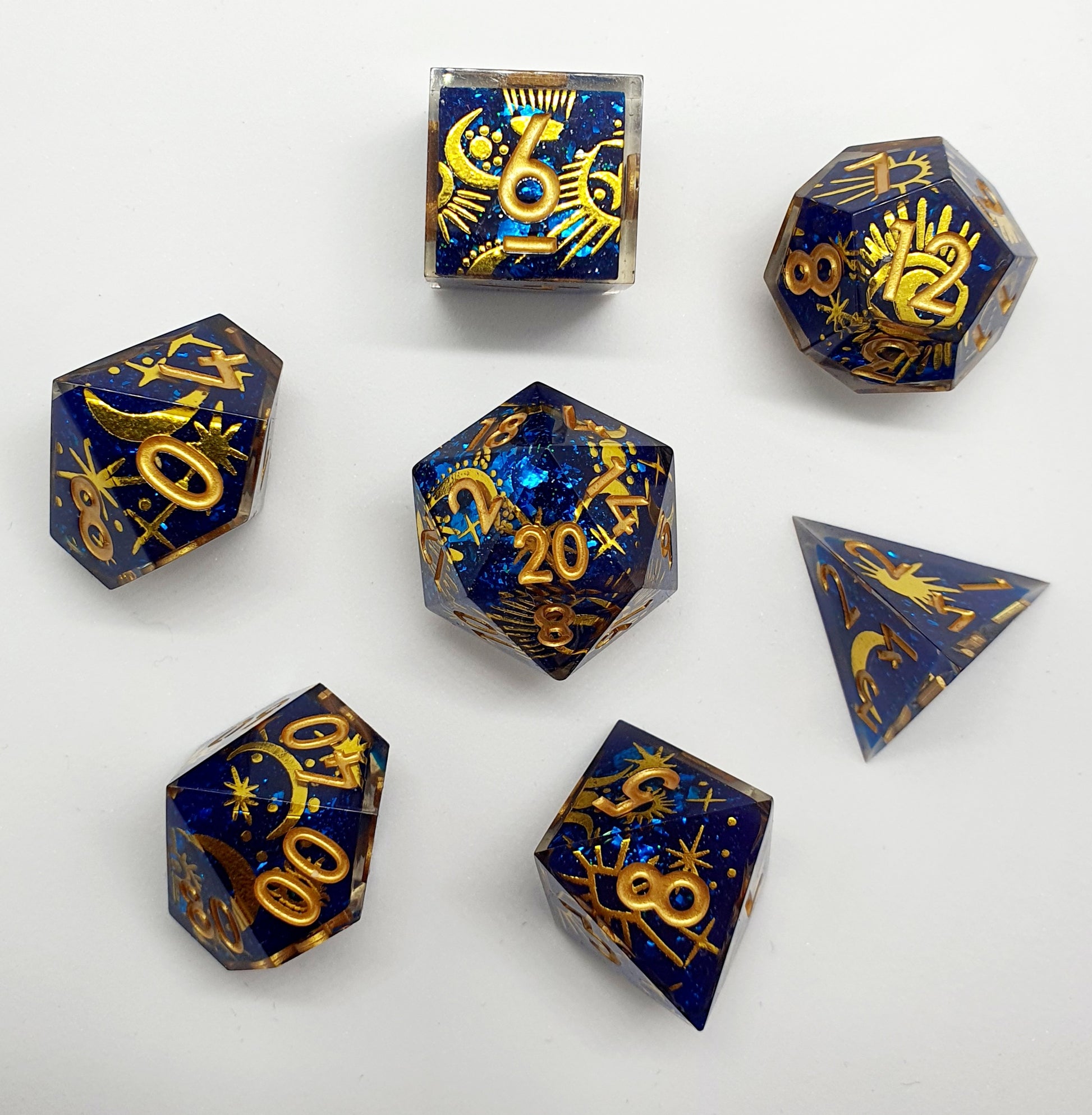 A clear resin "exoskeleton" or "shell" embraces each die, adding depth and intrigue to the overall aesthetic giving these a deeper look and an extra shine in the light.