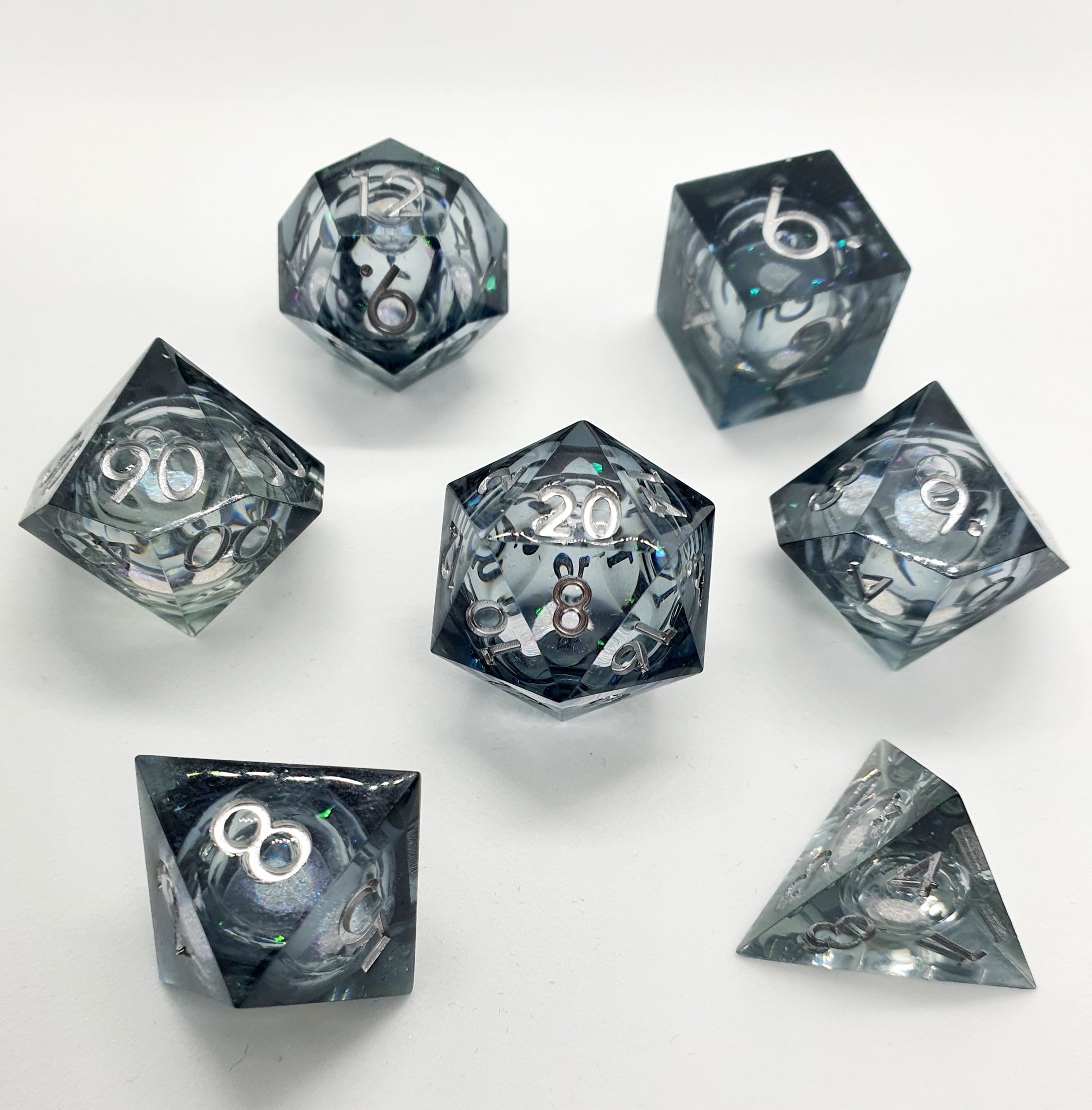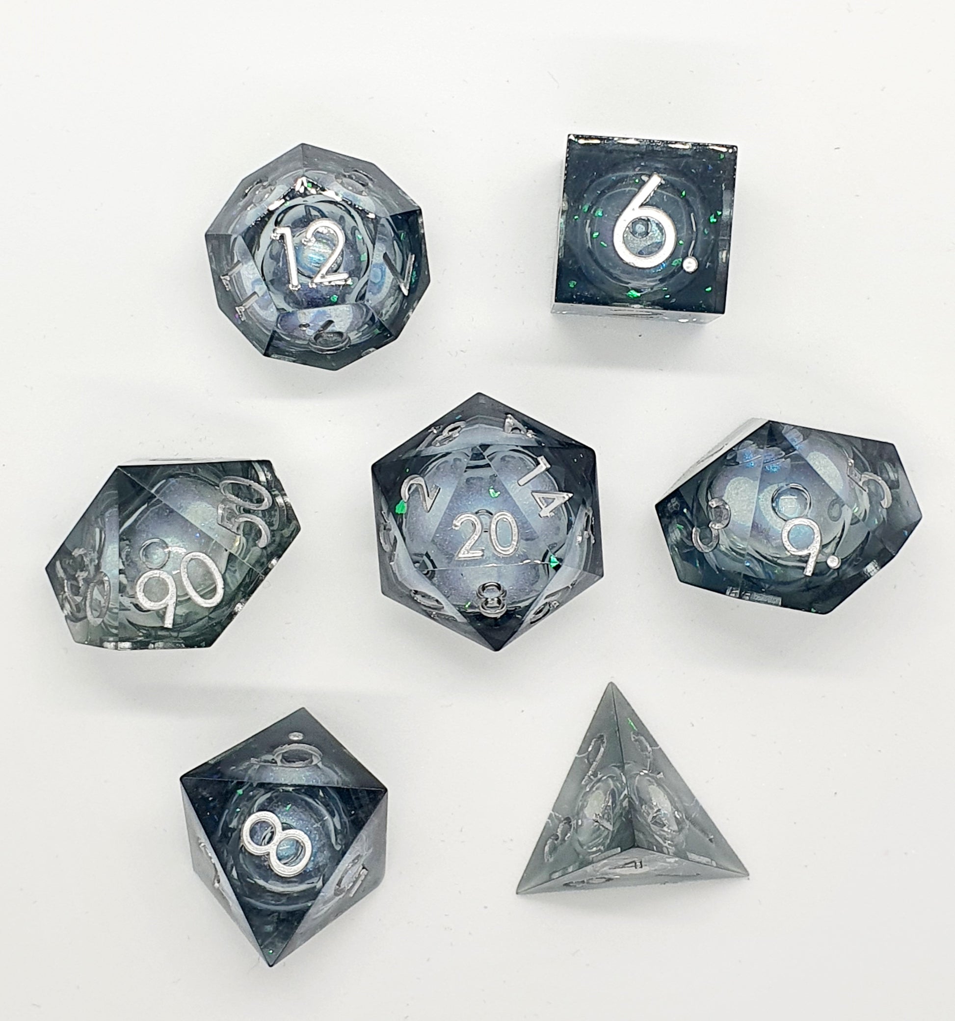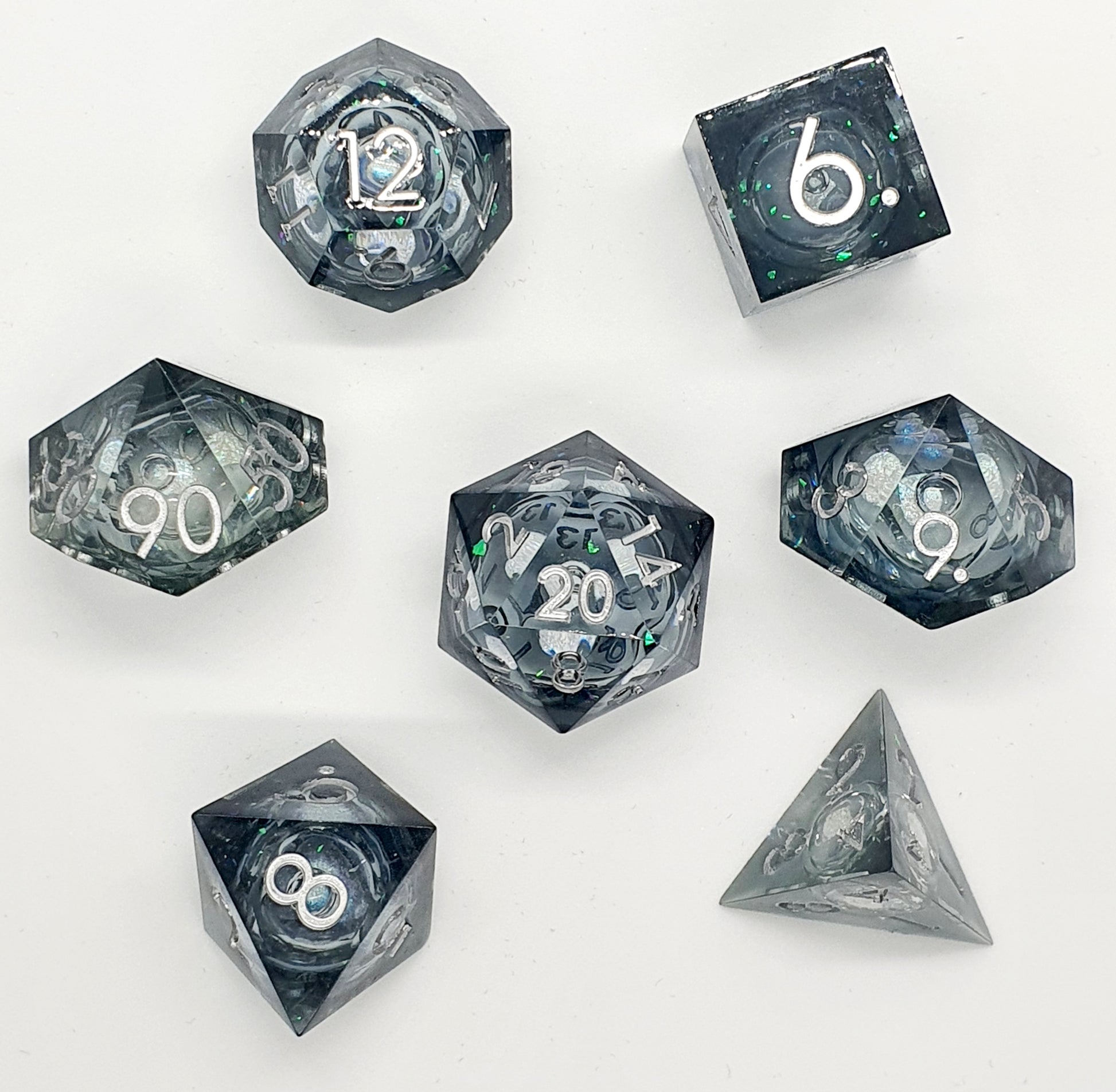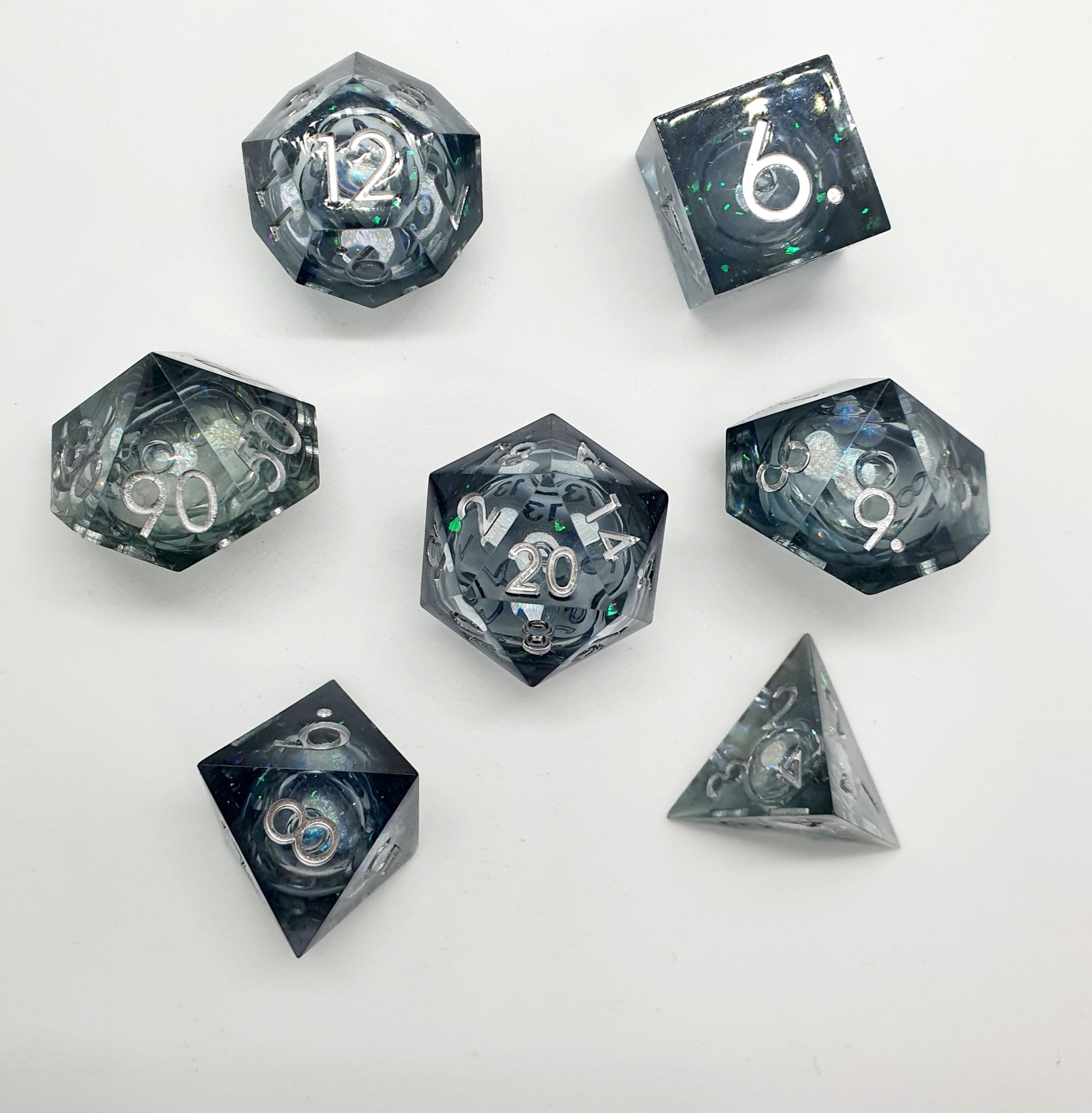 The Shadow Singer set is a full set of Liquid core, sharp edge Polyhedral dice (d4, d6, d8, d10, d12, d20 and %)