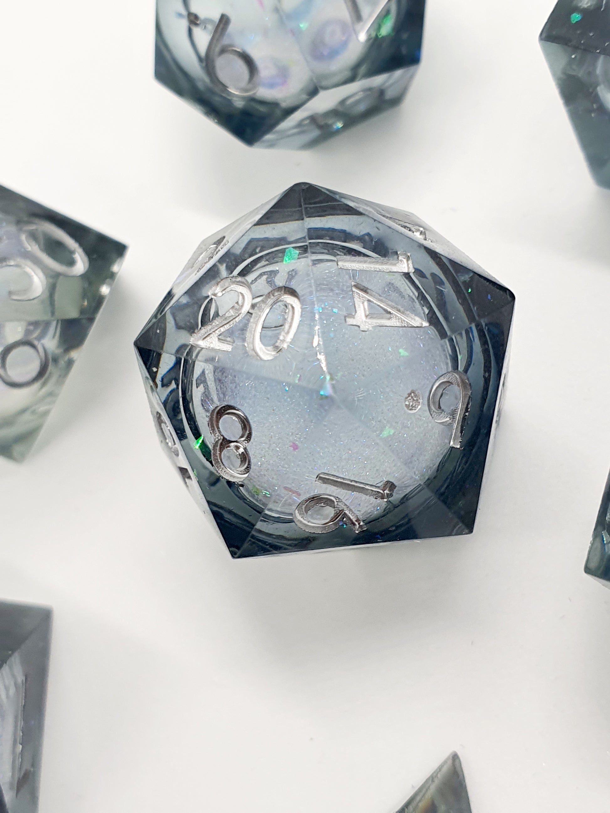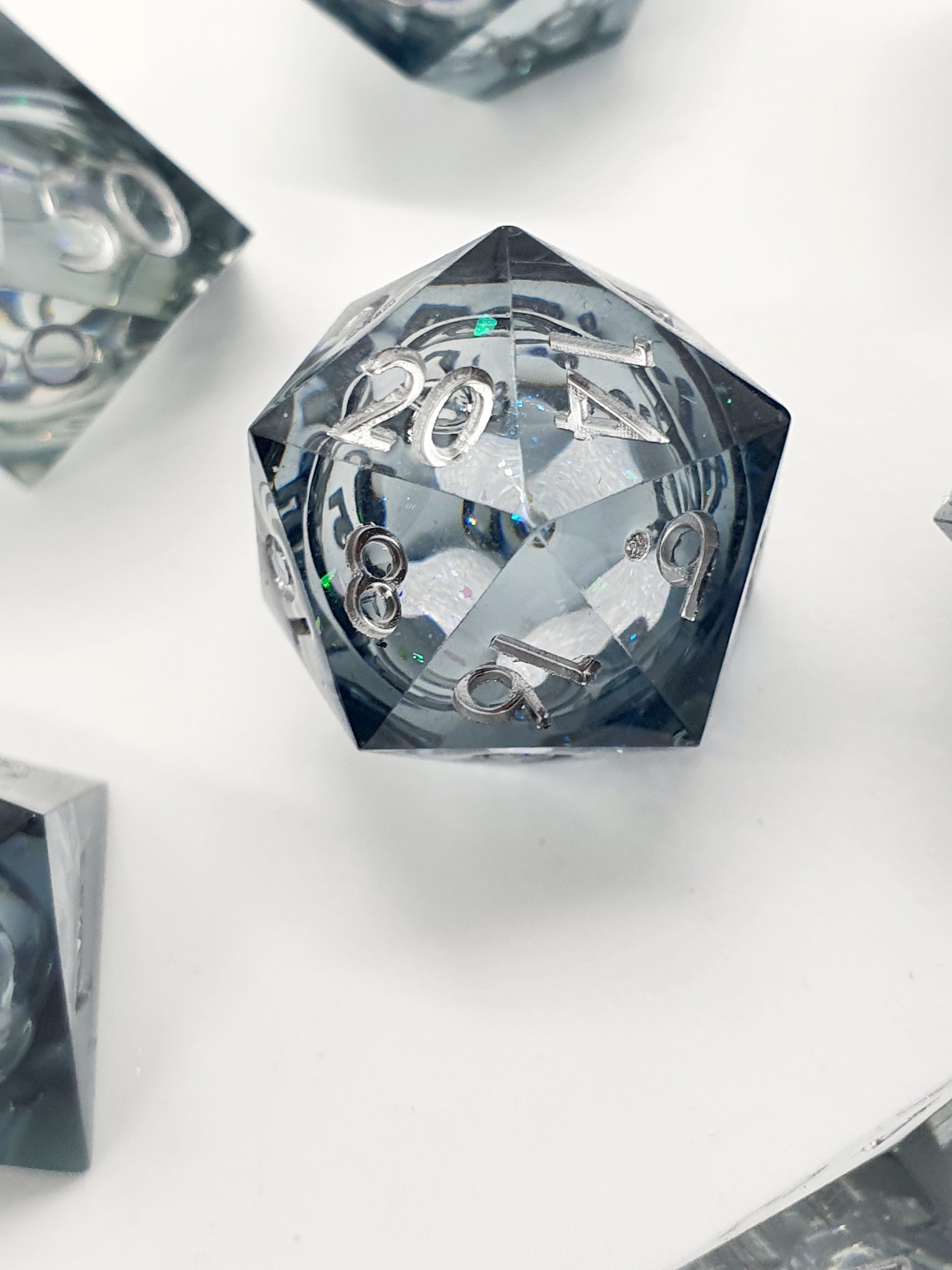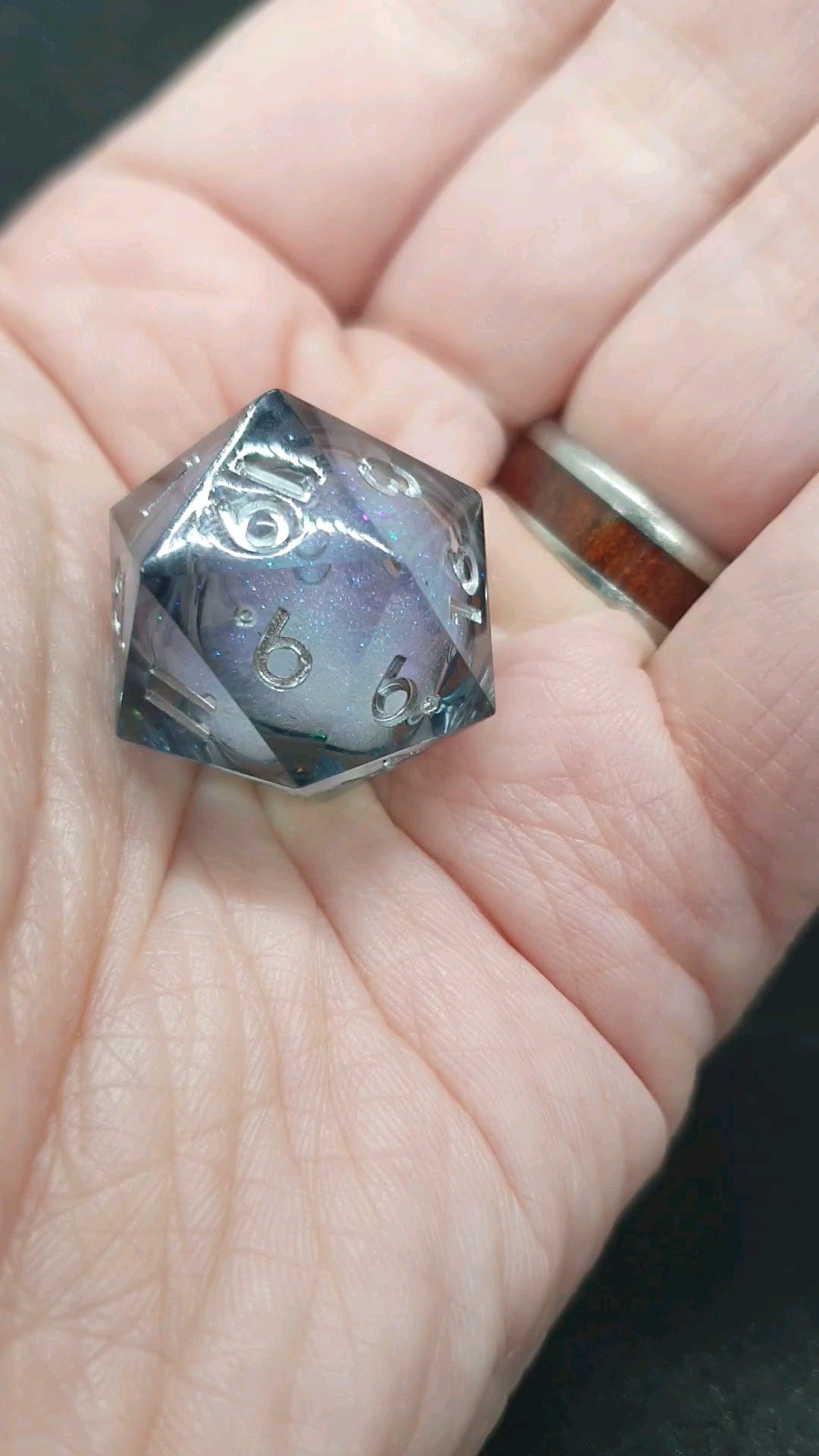 These dice have a liquid filled sphere at their core, combined with mica powders to create swirling magical effects .The liquid swirls and rotates as you roll the dice, therefore its impossible for them to be weighted on any one number.