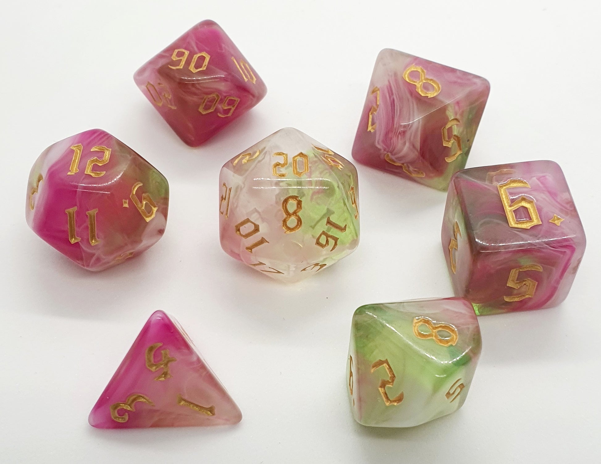 Full set of Polyhedral dice (d4, d6, d8, d10, d12, d20 and %)