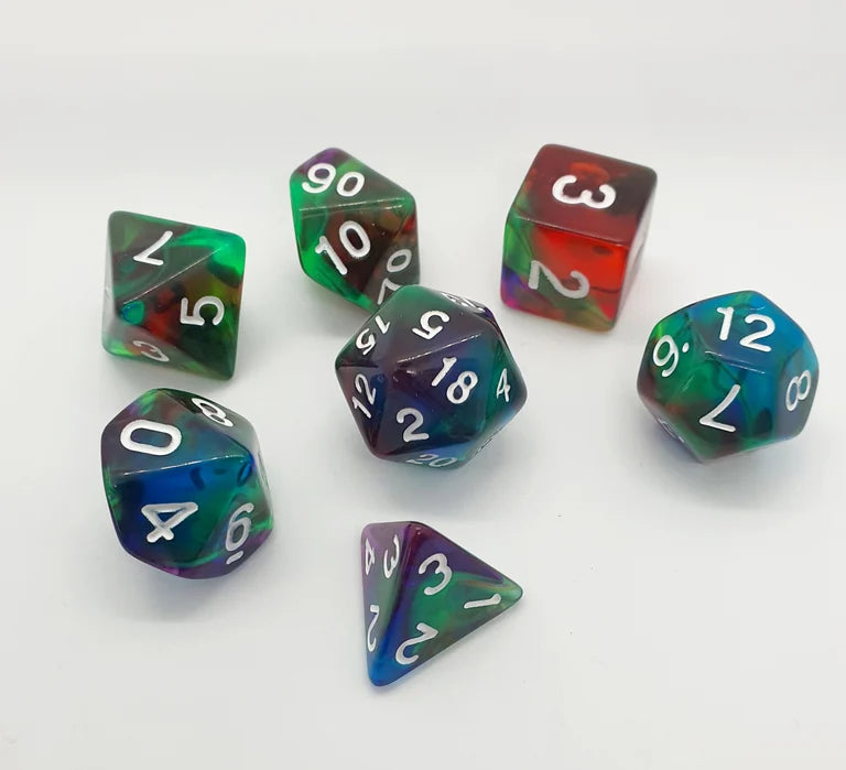 Vivid colours of reds, blues, greens and violet swirled throughout for a stunning set of dice