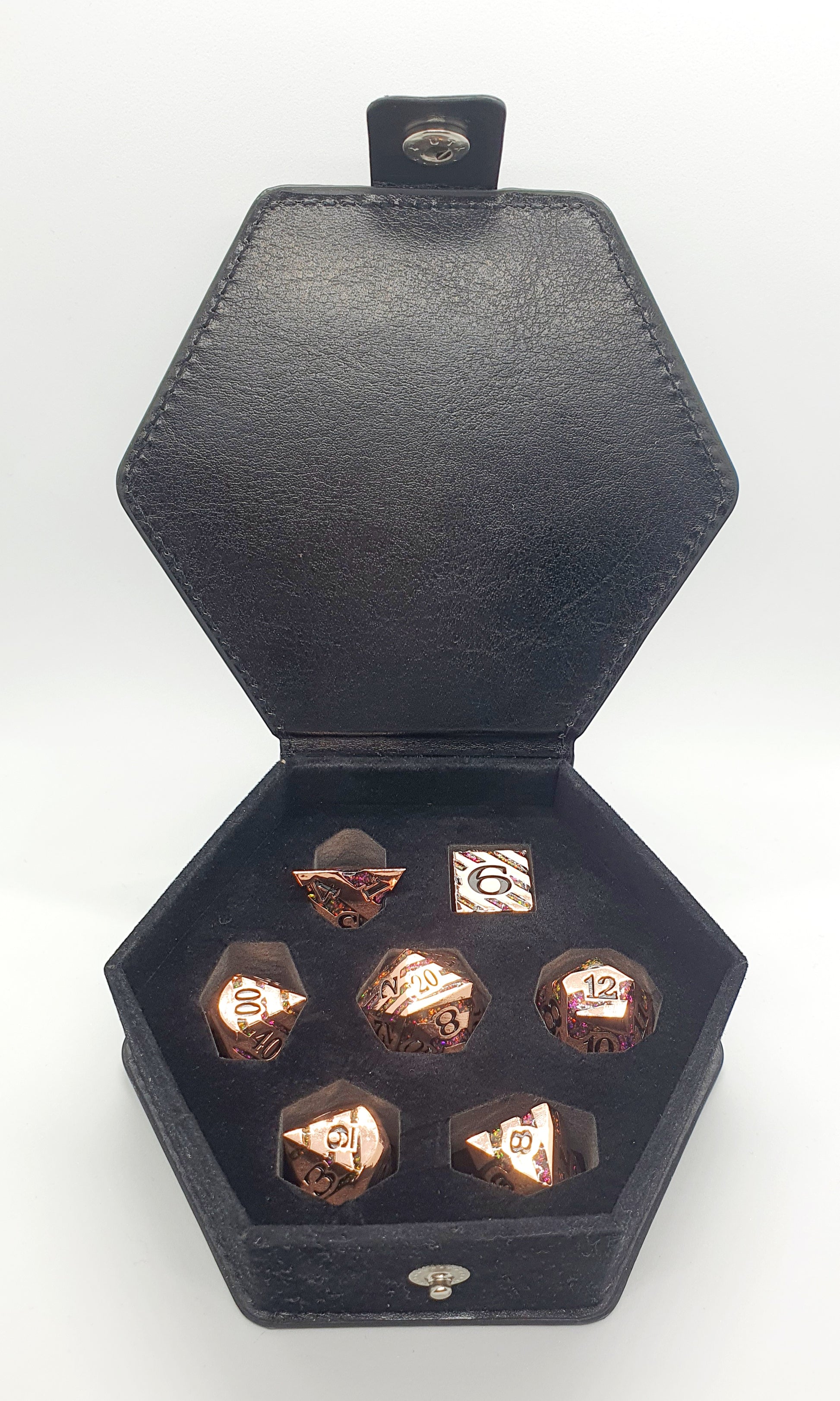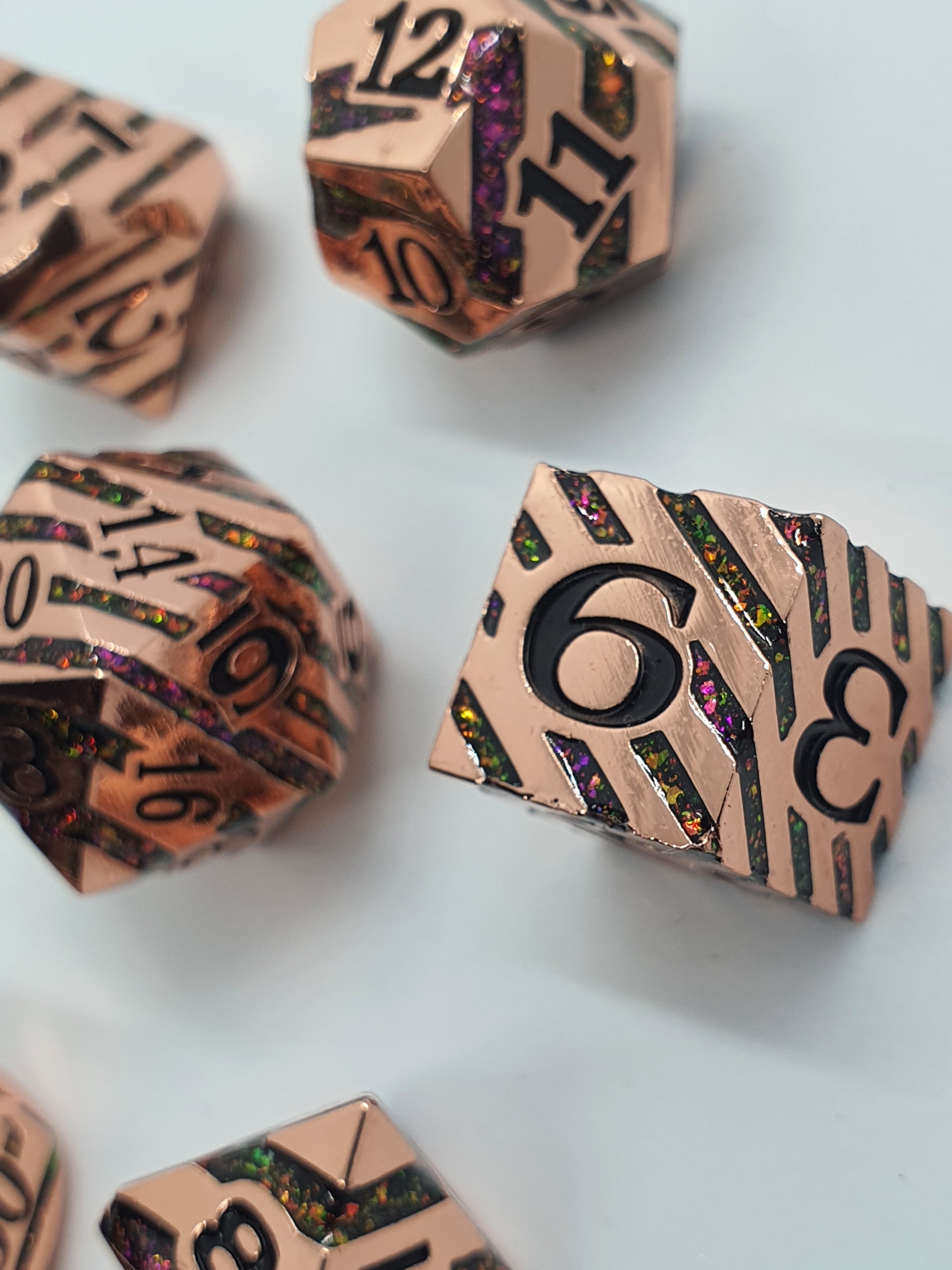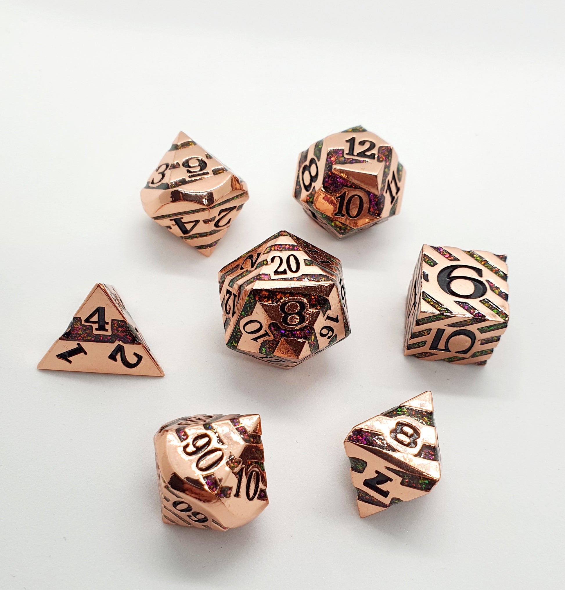 Full set of polished copper Polyhedral dice (d4, d6, d8, d10, d12, d20 and %) with engraved numbers and multi-coloured resin swirls throughout.