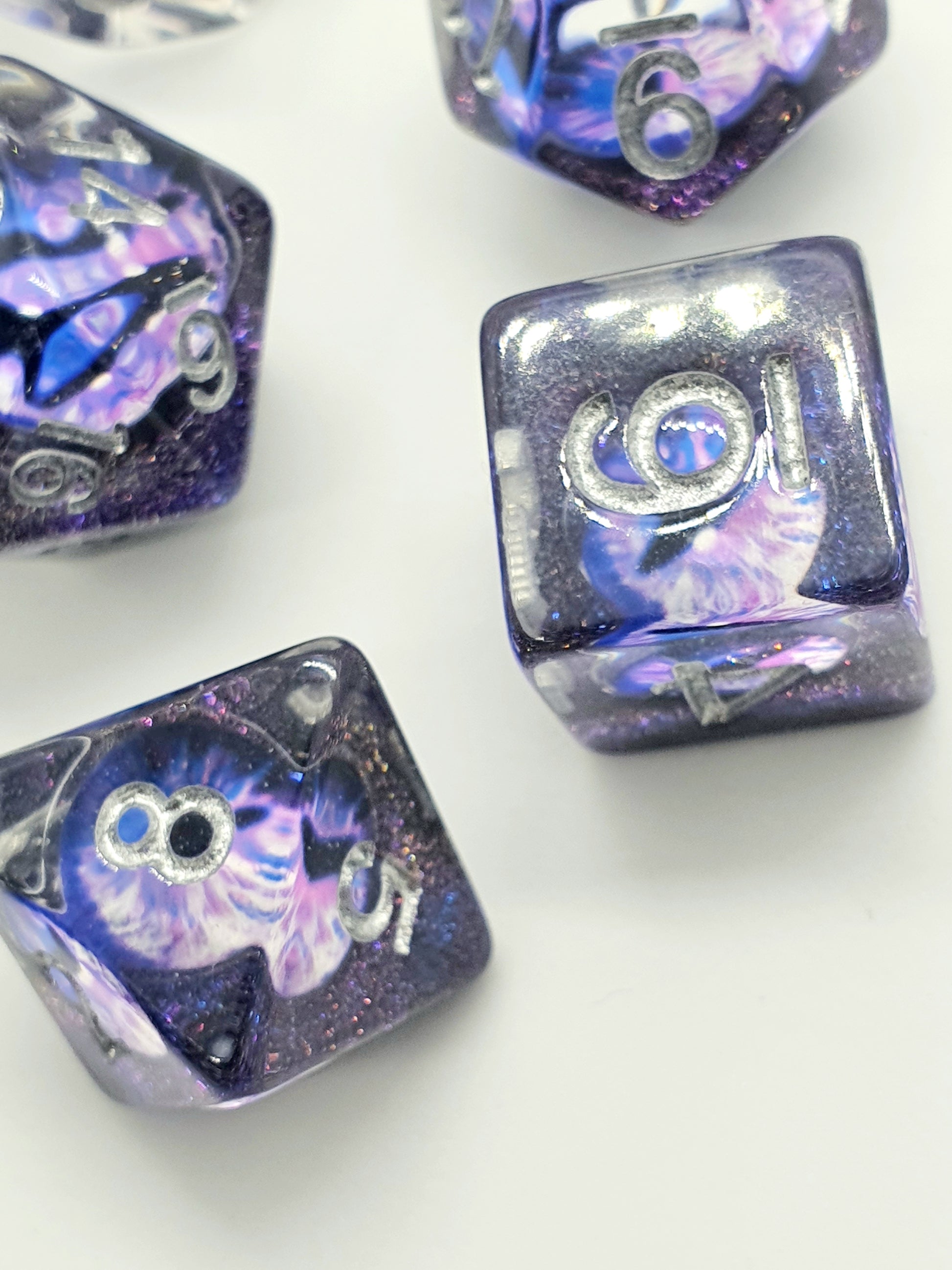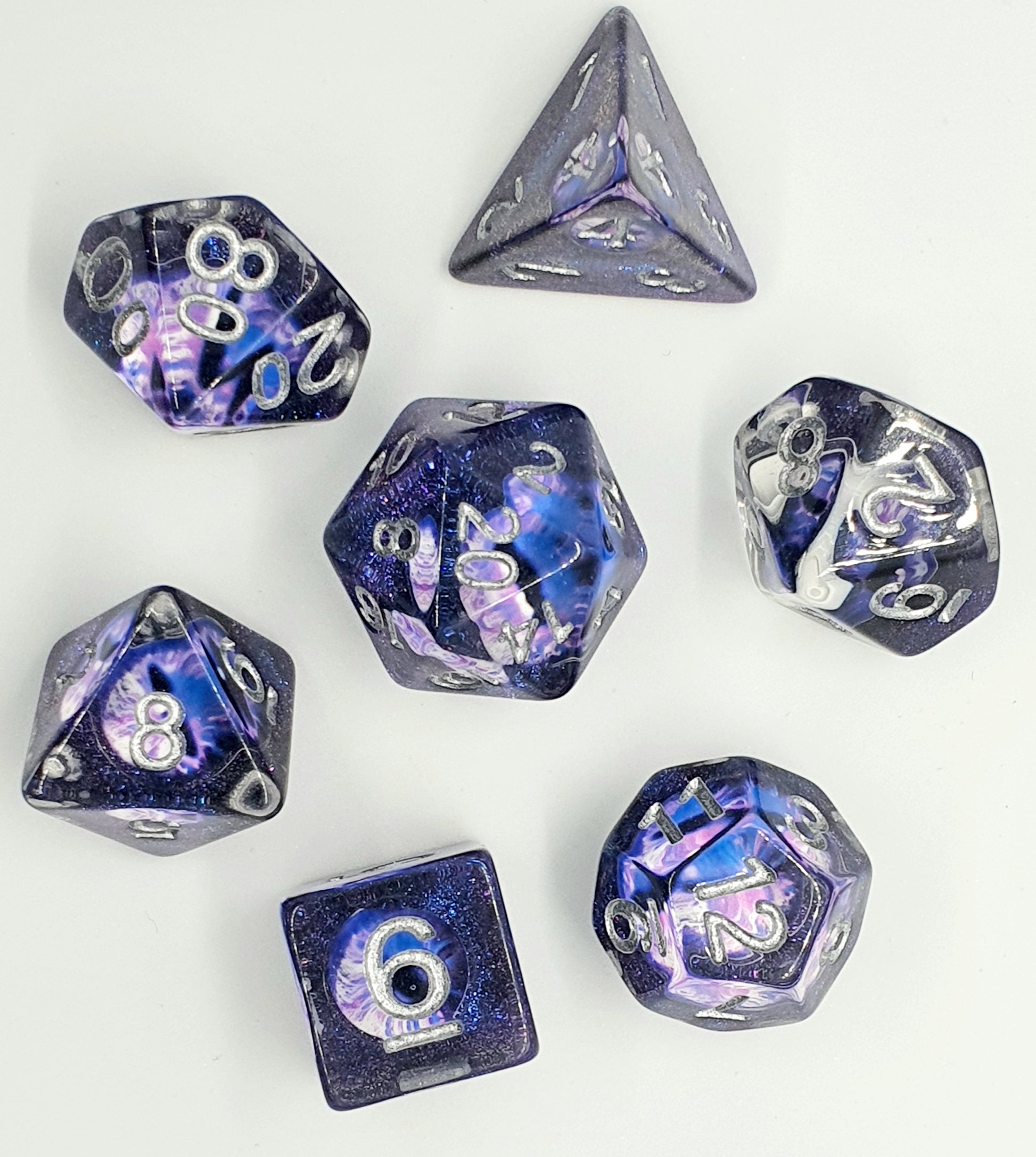 Full set of Polyhedral dice (d4, d6, d8, d10, d12, d20 and %) with added demon eye inclusions inside each one.